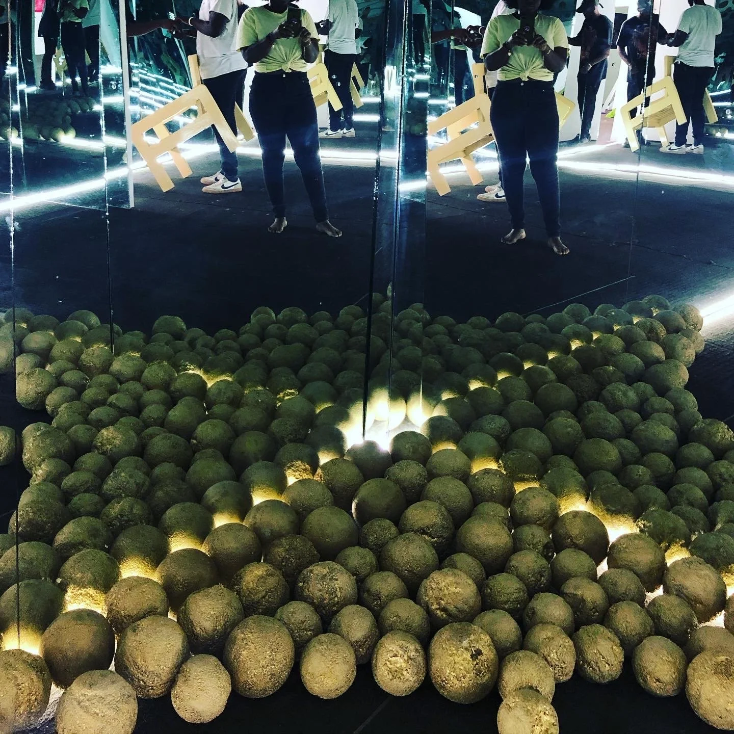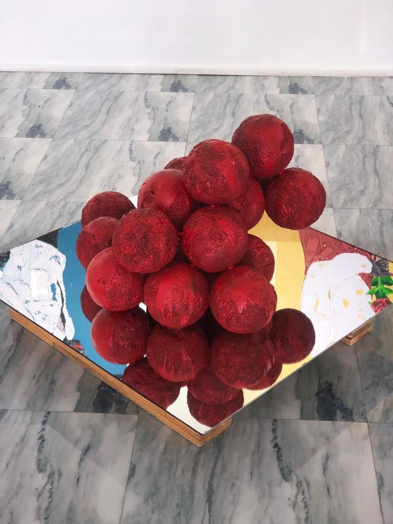 Abstraction of Primal Spheres II, 2021 Acrylic, Styrofoam, and glass mirror stand 40 inches x 40 inches